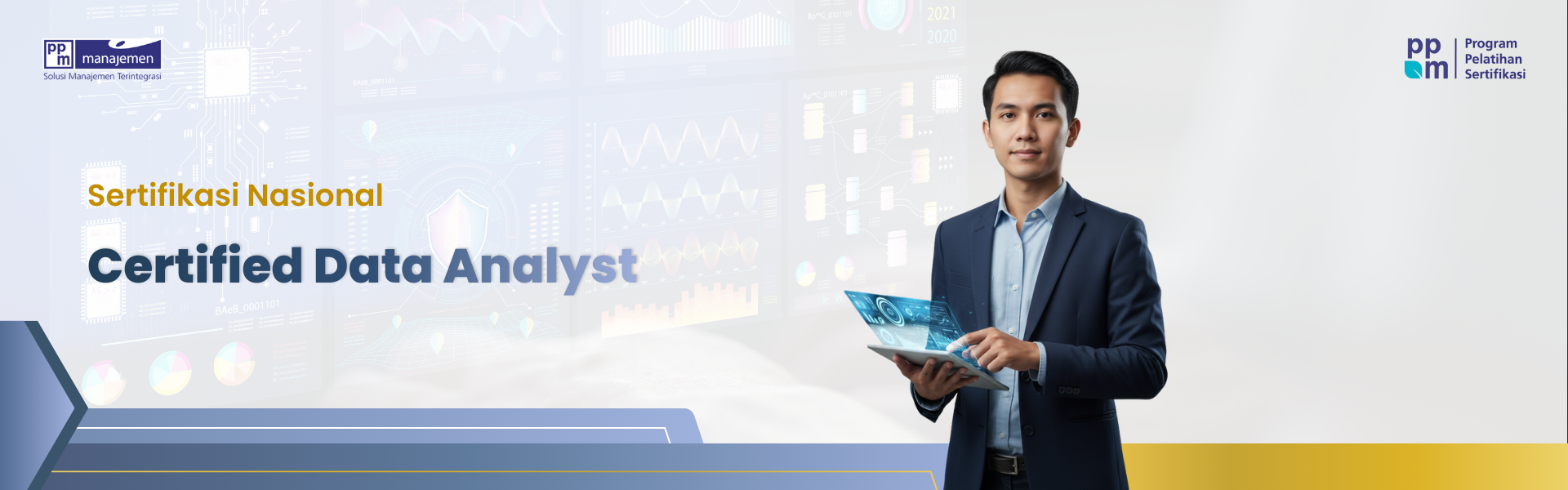 Program Certified Data Analyst (CDA) dari PPM Manajemen, yang telah tersertifikasi BNSP melalui LSP Data, dirancang untuk membekali peserta dengan tujuh unit kompetensi inti dalam analisis data—mulai dari tahap pengumpulan hingga penerapan data untuk strategi bisnis. Pelatihan ini memastikan peserta memiliki keahlian profesional yang diakui dan siap menghadapi tantangan transformasi digital.